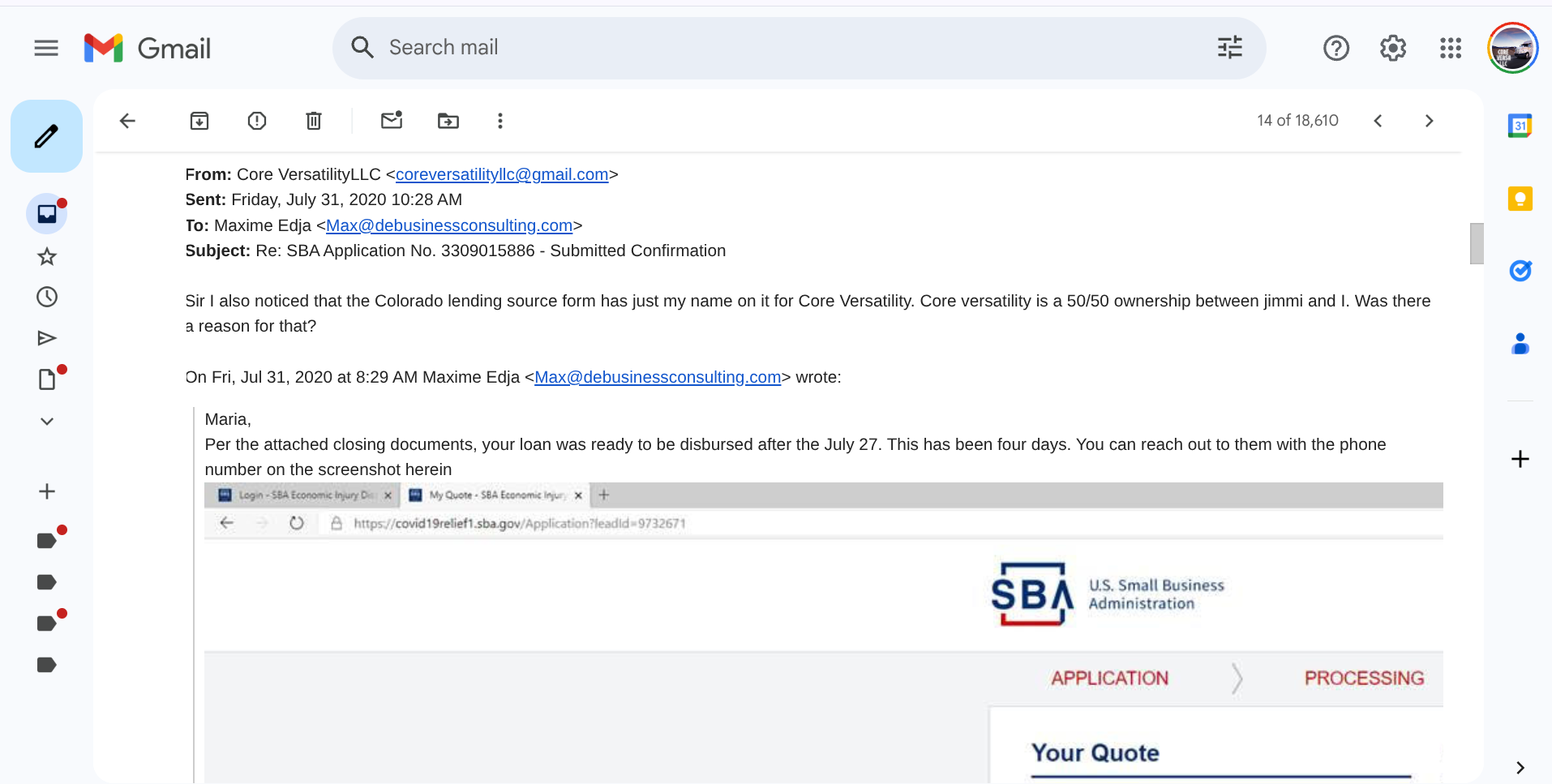 Behind my back, with the aid of Max, Maria took PPP loan money from both companies and siphoned it into different accounts and entities that I was not aware of. The approximately $20,000 PPP loan connected to Core Versatility LLC was diverted into an account I did not know existed. Likewise, the approximately $500,000 PPP loan connected to Jimar Logistics was siphoned into a separate account that Maria created independently, without my knowledge.